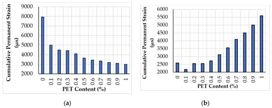 Moghaddam et al. [34] evaluated rutting performance under both static and dynamic loads. Figure 12 shows the results of static and dynamic tests, respectively. Under static loading conditions, mixtures with higher PET content showed higher rutting deformation than the control and the results indicated that the modified mixtures did not perform as well under static applied loads except the modified mixtures 1% PET have the lowest amount of permanent deformation. On the other hand, the permanent deformation decreases under dynamic loads compared to the control mixture and the mixtures modified with PET and the deformed mixture still recovered back to its original state.