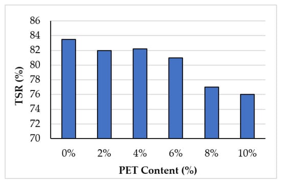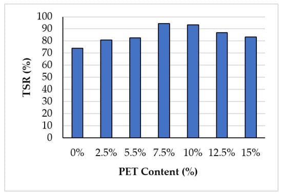 Ahmadinia et al. [40] assessed the moisture susceptibility of SMA mixtures modified with PET particles. The findings of the tensile strength test of the control mixture and PET-mixtures are displayed in Figure 13. The results show that the addition of PET in the asphalt mixture reduced the tensile strength and tensile strength ratio (TSR). This result is attributed to the properties of PET, which is a semi-crystalline material. After mixing with a binder, PET holds the binder on its surface and reduces the thickness of the asphalt film that coat aggregates. In turn, the resistance against moisture damage reduces. Taherkhani and Arshadi [45] concluded that PET modification caused antistripping effects. The improved resistance to moisture could be due to the impact of the PET stiffening the asphalt binder when adding in a lower amount. Furthermore, the resistance to moisture damage increased with the addition of a higher percentage of PET particles (up to 4% PET), resulting in decreased asphalt binder film thickness as shown in Figure 14.