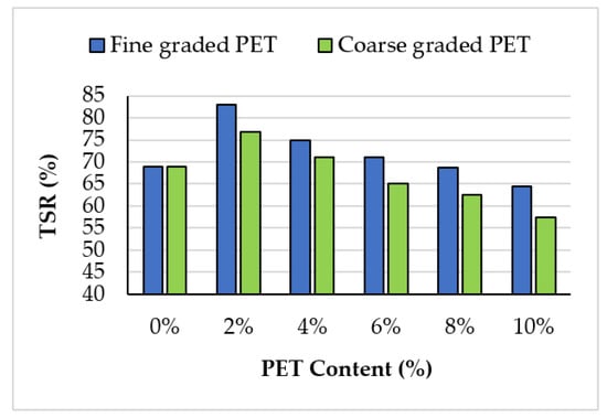 The mixtures that contain fine or coarse graded PET particles showed a higher value of TSR, this result indicates that PET could be used in the asphalt mixtures as an anti-stripping agent. The improvement in moisture resistance can also be attributed to the stiffening of PET modified asphalt mixture at lower PET contents. Furthermore, the ITS results decreased at higher PET contents due to the reduction of asphalt binder workability and the reduction in thickness of binder film that covered the aggregate, results in more damage caused by moisture [45,48]. On the other hand, the resistance to moisture damage is the least in PET modified asphalt mixtures, this might be due to the increase in cohesion of the mastic, mechanical adhesion, rheology of the filled binder, and surface energy [39].