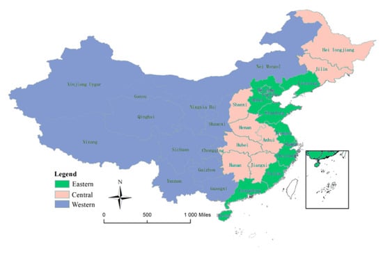 We have divided 31 provinces and municipalities according to national policies, economic development status and geographic location [44]—eastern, central, and western regions (see Figure 1).