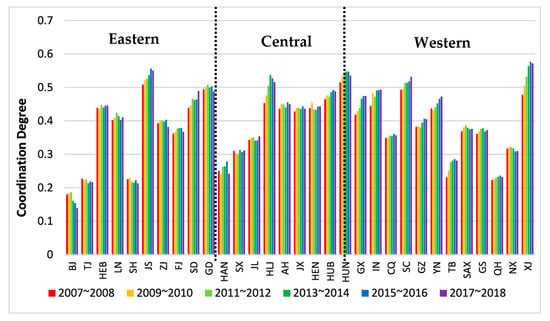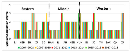As shown in Figure 3, there are 15 provinces in the low coordination degree, including six provinces in the eastern region (Beijing, Tianjin, Shanghai, Zhejiang, Fujian, and Hainan), two provinces in the central region (Shanxi and Jilin) and seven provinces in the western region (Chongqing, Guizhou, Tibet, Shaanxi, Gansu, Qinghai, and Ningxia). There are 11 provinces in the middle coordination degree, including four provinces in the eastern region (Hebei, Liaoning, Shandong, and Guangdong), four provinces in the central region (Anhui, Jiangxi, Henan, and Hubei) and three provinces in the western (Guangxi, Inner Mongolia, and Yunnan). There are only five provinces in the high coordination degree; one province in the east (Jiangsu), two provinces in the central region (Heilongjiang and Hunan), and two provinces in the western region (Sichuan and Xinjiang).