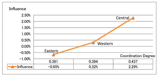 Figure 4 shows that the influence of coordination degree of the WEF system on regional economic development is negative in the eastern region, while it is positive in the central and western regions. In regions with a low coordination degree, improving the coordination degree will hinder regional economic growth; in regions with a high coordination degree, improved coordination degree of the WEF system will promote regional economic development. It proves that the promotion effect is more obvious in the regions with higher coordination degree.