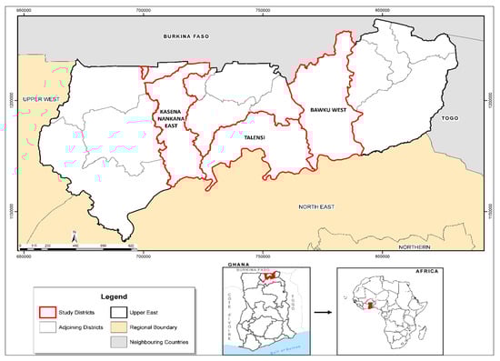 The study was conducted in Ghana’s Upper East Region, which lies between Longitude 0° and 1° W, and Latitudes 10° 30′ N and 11° N [11] (Figure 1). The Upper East region was purposely selected because of the region’s high climate change vulnerability, coupled with high incidence of poverty [6,11]. The region is located in the Sudan savannah agro-ecological zone and is characterized by high rainfall variability. It has a unimodal rainfall patterns, receiving an average of 1000 mm per annum [40]. There is a marked variation in the onset, intensity, and duration of the rainy season. Three local assemblies were selected for fieldwork, including Bawku West District, Kassena Nankana Municipal, and Talensi District, based on advice from regional agricultural development officers.