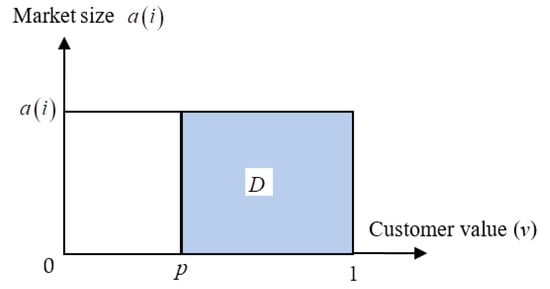 For the consumer, we assume they are heterogeneous in the perception of the product value, and their customer value, , is uniformly distributed over within the market size . A similar distribution function of the customer value was commonly used in the literature (e.g., [4,24,32]). The insights of this paper are valid for this distribution function. Given the product price , if —that is, —a consumer will buy the product (see Figure 2). Therefore, the market demand is