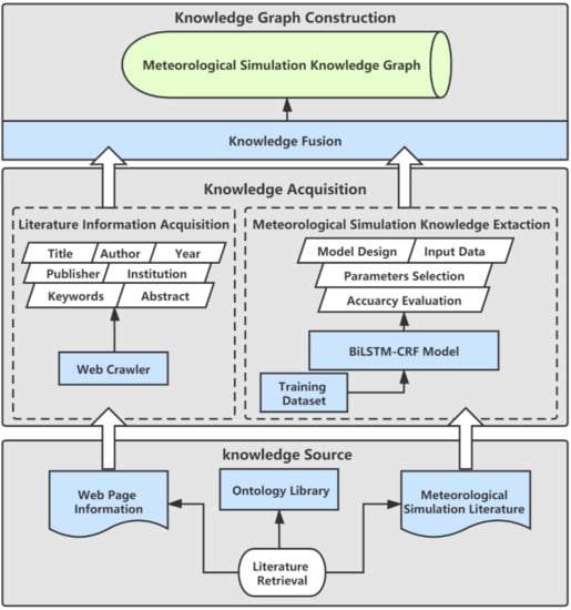As shown in Figure 1, the research framework of meteorological simulation knowledge extraction and knowledge graph construction consists of three main components: preparation of the knowledge source, acquisition of meteorological simulation knowledge, and construction of meteorological knowledge graph. In the first component, the meteorological simulation literature published online was collected, the semi-structured information on the web pages and the literature content was selected as the knowledge source, and a meteorological simulation ontology library was constructed. The second component is the key part of this research, which includes the literature information acquisition from semi-structured web pages by web crawler and knowledge extraction from unstructured literature content by a bilateral long short-term memory-conditional random field (BiLSTM-CRF) model. Subsequently, in component 3, the fusion of knowledge from diverse sources was conducted, and the meteorological simulation knowledge was ultimately constructed.