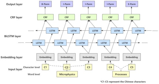 Since the knowledge in meteorological simulation literature is distributed in plaintext, natural language processing technology is required to process the semantic information and recognize the knowledge entity. The BiLSTM-CRF model is a natural language processing model based on deep learning, which is widely used in knowledge recognition and extraction; it has an excellent performance in unstructured text processing [49]. Knowledge recognition and extraction is essentially a sequence labeling task, an input sequence of sentence is processed by the BiLSTM-CRF model and it outputs a label sequence, which labels the knowledge entities in the sentences. The BiLSTM-CRF model is composed of two layers of long short-term memory (LSTM) with forward and backward directions, and a layer of conditional random field (CRF).
