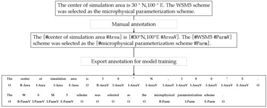 Based on the annotation scheme, the corpus was manually annotated, and each character in the corpus was regarded as a token and matched to a corresponding label. Figure 5 shows the annotation for a sample sentence: “The center of simulation area is 30° N,100° E. The WSM5 scheme was selected as the microphysical parameterization scheme (in Chinese).” As the exported annotation shows, a complete knowledge entity is composed of a B-entity label in the beginning, several I-entity labels in the middle, and a E-entity label in the end sequentially.