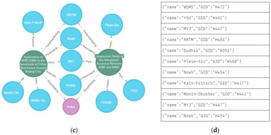 Figure 7. Knowledge retrieval by Cypher query language, (a) input data query; (b) study area query; (c) parameter setting query; (d) JSON file of parameter setting query result.