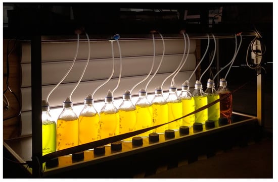 Experiments regarding microalgal growth in the paper industry effluent were performed in batch mode, using 1000-mL borosilicate bottles as a cultivation system. To offset possible toxic effects of the paper industry effluent on microalgal growth, as well as light limitation due to the effluent color, different effluent concentrations were evaluated: 20%, 40%, 60%, 80%, and 100%. These concentrations were prepared by diluting the nitrogen-supplemented effluent with distilled water. In addition to these conditions, microalgal growth was promoted using the modified OECD test medium as the culture medium (positive control), and the raw effluent (100%) supplemented with nitrogen without microalgae was submitted to the same culturing conditions (negative control). The different effluent compositions and the positive control were inoculated with 40 mL of a previously centrifuged C. vulgaris inoculum, giving an initial biomass concentration of approximately 120 mg DW L−1. Except for the positive and negative controls, all the experiments were performed in duplicates. After inoculation, the cultures were allowed to grow for 14 d under continuous light supply provided by light-emitting diode (LED) lamps placed in parallel with the bottles, with photosynthetically-active radiation (PAR) of 202.9 μmol m−2 s−1. The CO2 necessary for microalgal photosynthesis was supplied to the cultures through the continuous injection of atmospheric air, previously filtered by 0.22-μm cellulose acetate membrane filters, at a flow rate of 1.5 L min−1, using AP-180 air pumps (Trixie, Flensburg, Germany). Air injection was also performed to promote the cultures’ mixing and avoid microalgal sedimentation. To keep the adequate temperature for microalgal growth in the coldest days, a 265-W heating tape (J.P. Selecta, Barcelona, Spain) was placed in the experimental facility. Figure 1 presents a picture of the experimental setup.