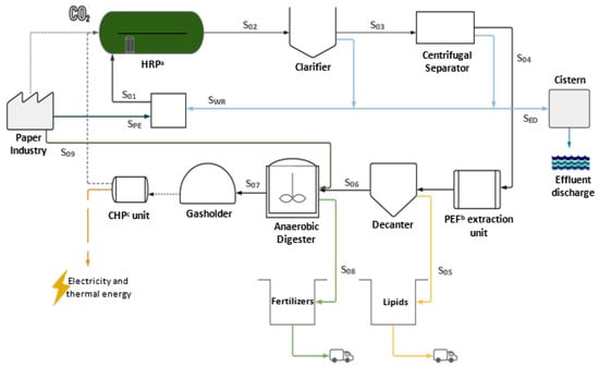 To ensure an adequate microalgal growth, it is necessary to supply the cultures with the essential nutrients for their growth. Nitrogen and phosphorus are available in the culture medium that enters the HRP through S01 stream. This medium is a mixture of the effluent resulting from the paper company (SPE) with the plant recycle effluent (SWR). Carbon is supplied to the culture through the injection of flue gases resulting from: (i) the biomass plant of the paper company; and (ii) the combined heat and power (CHP) units from the proposed biorefinery and the paper company, where generators burn biogas to produce, simultaneously, electricity and heat. The carbon is assumed to be supplied as 100% CO2 and to be free from any impurity that might negatively impact microalgal growth (e.g., sulfur or nitrogen oxides) [28]. Biomass harvesting is done following a two-stage approach [29,30]: (i) first, a thickening step, flocculation, is applied to make biomass settle faster in the clarifier and to separate it from the culture medium (S03) more easily; and (ii) a dewatering step will be promoted, where biomass is centrifuged to end up with a concentration of approximately 20% (w/w) (S04). From all the cell disruption and products’ extraction techniques, pulsed electric field (PEF) was the selected one. This technique presents several advantages: (i) avoids the use of chemicals; (ii) can be easily scaled up; (iii) does not require a dewatering process; (iv) has a very short treatment time; and (v) has low energetic requirements and operational costs [31,32,33,34]. The lipids extracted (S05) can then be sold to the above mentioned agro-industrial company that will transform microalgal lipids into biodiesel through transesterification. The biomass resulting from the lipids’ extraction step is then sent to an anaerobic digester (AD) to be stabilized (S06). Part of the sludge from the paper industry wastewater treatment plant (WWTP), S09, is also sent to the AD. As a result of this process, biogas (S07) and biofertilizers (S08) are produced. The biogas is burned to produce electricity and heat that can be further used to fulfill the biorefinery energy and heating needs.