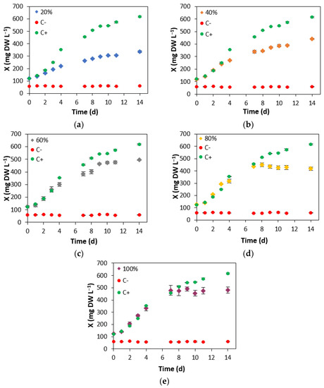 where and are the biomass concentrations (mg DW L−1) in the final and initial ( instants of the cultivation period, respectively.