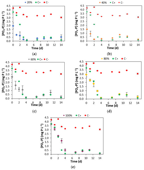 Phosphorus concentration variation over time for C. vulgaris grown in the positive and negative controls and under different paper industry effluent compositions: (a) 20% effluent; (b) 40% effluent; (c) 60% effluent; (d) 80% effluent; and (e) 100% effluent. Error bars correspond to the standard deviation of the mean obtained from two independent experiments.