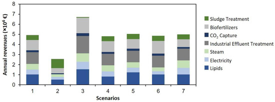 For the proposed biorefinery, the following revenues were assumed: (i) lipids extracted from microalgal biomass and sold to biodiesel production industries at 1 € kg−1; (ii) treatment of the paper industry effluent with a credit of 2.40 € per kg of phosphorus removed [63,64]; (iii) steam and electricity production in the CHP unit and sale at 0.14 € kWh−1 [63,65]; (iv) treatment of the sludge from the paper industry WWTP at 25 € ton−1; (v) biofertilizer production in the anaerobic digestion stage, sold at 0.40 € kg−1 [65]; and (vi) CO2 uptake for microalgal growth, with a credit of 30 € t−1 [64,66].