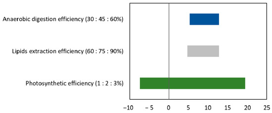 Seven scenarios were considered in this study, being characterized according to three important parameters for the biorefinery performance (Table 1). Scenario 1 (defined as the base scenario) is characterized by a photosynthetic efficiency (PE) of 2%, which corresponds to a biomass productivity of 15.7 g m−2 d−1, a lipid extraction efficiency of 75%, and an anaerobic digestion efficiency of 45%. Scenarios 2 and 3 are different from Scenario 1 concerning PE in order to evaluate the influence of this parameter on the biorefinery viability. In Scenarios 2 and 3, PE was considered 1% and 3%, respectively. According to Carvalho et al. [35], in outdoor reactors, the PE values rarely exceed 6%. Other authors compared different outdoor reactors and determined that the highest PE obtained for HRPs was 1.5% [36]. These values are typically low, due to different losses caused by reflection, photoinhibition, photon absorption, light saturation, among others [37]. Scenarios 4 and 5 are different from the base scenario regarding the efficiency of lipids extraction by the PEF unit. Lipids extraction efficiencies of 60% and 90% were defined in Scenarios 4 and 5, respectively. Numerous studies have already presented this range of values (60–90%) for PEF extraction efficiency [38,39]. To evaluate the impact of the anaerobic digestion efficiency on the plant performance, this parameter was defined as 30% and 60% in Scenarios 6 and 7, respectively. This range of values for anaerobic digestion efficiency has already been reported in the literature [40].