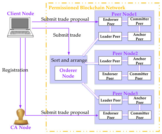 The basic network architecture of a permissioned blockchain contains the following nodes: Client Node, certificate authority (CA) Node, Peer Node, and Orderer Node, and it is shown in Figure 3.