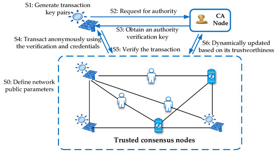 The establishment of energy management modes requires the deployment of smart contracts. When network parameters have been defined, power producers or users could generate transaction key pairs based on their ID. They request for authority to a CA Node, and receive an authority verification key. If the new member’s ID mappings meet the permission conditions, they could obtain issue credentials, otherwise they ca not join the system. The permissioned members use the verification and credentials anonymously for transaction processing, and the trusted consensus nodes that have been elected in the blockchain network verify the transaction to determine execution or rejection. The CA Node is elected by trusted consensus nodes and is dynamically updated based on its trustworthiness. It should be noted that, in microgrids, the trusted consensus nodes are generally composed of regional energy authorities and reliable power suppliers. A typical trade in the permissioned blockchain is shown in Figure 4.