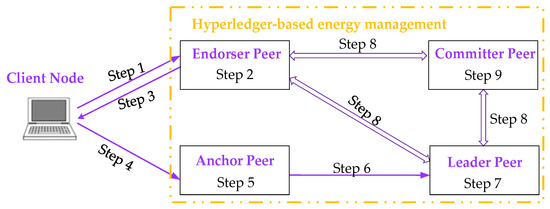 Step 8. Leader Peers synchronize the latest blocks within the organization. If the new energy management transaction is invalid, the blocks will also be generated in chronological order, and the system state will not be affected, in that the invalid information will not perform energy scheduling.