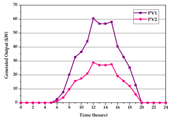 In order to facilitate energy management of the system, we divided the original microgrid into PV1, FC, and Load. The FC contained the electrolyzer, compressor, tank, FC device, and other hardware equipment. The newly added PV power generation equipment was named PV2. We set the price of electricity for all PV equipment at USD 0.15 per kWh [49]. Due to the high construction cost of current energy storage equipment, the power generation price of FC was set at USD 0.18 per kWh. The loss of the FC’s charge and discharge was 6%. An off-grid microgrid on an island in East China (122.40° E, 30.10° N) was utilized for the simulation analysis of the PV equipment. The PV radiation intensity parameters α and β were selected as 0.3 and 8.54, respectively, based on the one-week solar radiation data on the island [50]. The generated output of PV1 and PV2 was calculated, and is shown in Figure 6.