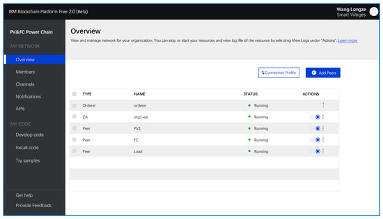 We established a permissioned blockchain named PV&FC Power Chain as the underlying technology framework for energy interaction, as shown in Figure 7. All smart contracts in this permissioned blockchain were created on the Hyperledger Fabric platform. The smart contract for the PV/FC generation microgrid consisted of three Peer Nodes, one CA Node, and an Order Node. Peer Nodes are used to process blocks of data, approve transfers, update and maintain ledger status, and verify identities. The nodes deployed and performed included PV1, Load and FC. The CA Node is a public key infrastructure and manages all certificates in the system, and it is functional node that the blockchain platform permits access to new equipment. The Order Node is responsible for processing all transactions in the system and maintaining the structure of the blockchain. Through deploying the energy management platform, the generation and power equipment of the microgrid system can interact with data and power.