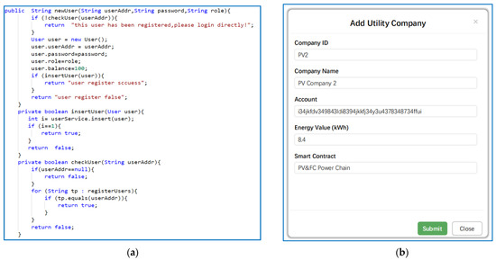 The permissioned blockchain that has been deployed contained only one PV power generation unit. We then registered and permitted a new PV Peer Node named PV2. PV2 obtained a specific account through PV&FC Power Chain which was the user’s permanent identity. Figure 8a shows the key computer code for new users to join the system, and Figure 8b demonstrates the UI of PV2 registration and verification. ID information of PV2 was separated from entity authentication by means of an entity mapping protocol and zero knowledge proof. It should be noted that the behaviors of voting by person and penalizing by address could be recorded, but only the CA Node can refer to private information, such as entity mapping for PV2.