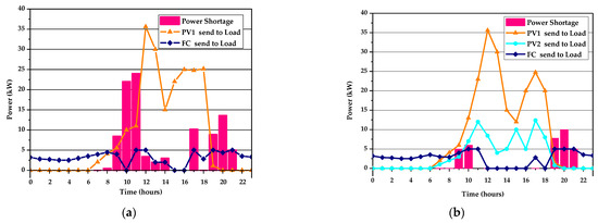 According to the energy usage characteristics of general residential areas, a typical daily supply load was set. There are two electricity consumption peaks in the day: in the morning to noon for agricultural production, and in the evening for life needs. Based on the energy management system and the operation strategies of PV and FC, the daily operation data of the original basic microgrid system and PV2 added to the microgrid were simulated, respectively. Figure 10 provides the operation before and after the addition of PV2 to the system. The original microgrid power generation system could not meet the demand, and the residential area was short of electricity by 101 kWh during the day, as shown in Figure 11a. After the newly built PV2 was added to the original microgrid system in plug-and-play mode, the power shortage phenomenon was effectively reduced, which is shown in Figure 11b. By simulation and calculation, the power shortage problem was reduced by nearly 70% after the addition of the PV2 generating units to the system.