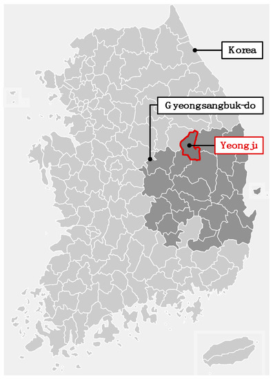 Yeongju is a small city in Korea that is not adjacent to large cities such as Seoul and Busan (Figure 1). The main source of income is apple farming and fabric production. The population of Yeongju is around 100,000; since the 2000s, it has rapidly decreased, giving way to the aging phenomenon [17], which has prominently occurred in the center of the region. Economic production activities have declined in relation to these demographic characteristics.