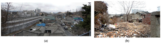 In the case of Korea, during 35 years of Japanese colonial rule, land was collectively organized according to the Urban Planning Act of Japan, and urbanization began in earnest in the 1960s after liberation in 1945 [2]. In particular, metropolitanization has rapidly progressed in areas such as Seoul, the capital city, and Daejeon and Busan, which are major transportation hubs. Today, the urbanization rate in Korea is 81.4% [3], and the gap between urban and rural areas is increasing. The Organization for Economic Cooperation and Development (OECD) has already highlighted this gap in Korea and mentioned the lack of policy to prepare for a decline due to aging [4]. Accordingly, the Korean government has set the following indicators to assess and manage such a situation: the decline is diagnosed through a decrease in the number of people and businesses and the deterioration of the living environment. The number of people and businesses decreases by 20% and 5%, respectively, for three years in a row; if more than 50% of old buildings are over 20 years old, the area is considered deteriorated [5].