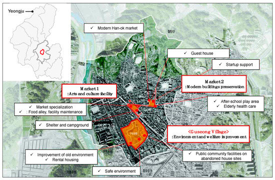 The scope of the regeneration project encompassed 1.51 km2 in total; it was divided into three regions according to the characteristics of each and was carried out over four years. The first two areas subject to improvement were markets: the project aimed to revitalize their surroundings by creating a space for culture and arts, preserving and using modern buildings that were 40–50 years old. Among the three districts, Guseong Village, with a population of 113,417 occupying 74,259 m2, was the key site for improvement [22] (pp. 16–17) (Figure 3). At that time, 71% of Guseong Village included old buildings that were over 30 years old. In addition, the proportion of the severely aging population aged 65 and over was 73.9%, with 35% being non-income earners and 29.29% being basic living recipients who had financial problems. This study identifies the development contents and implementation process of non-agricultural projects promoted through consultation with residents for the improvement and sustainability of Guseong Village.