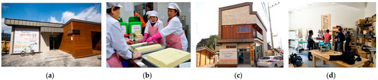 In accordance with the plan for a new production system for the sustainability of life, centered on the local elderly, the administration and experts in this regard decided on the program of public community facilities. Muk and woodworking were linked to facilities called Grandma Muk Factory and Grandpa Wood Factory, respectively, and each name was given by residents of the project teams. The administration ensured that these public community facilities became common hub spaces to maintain residents’ sustainable living. Accordingly, YCG purchased the neglected land in the area and constructed two facilities with a total floor area of 148.8 and 269 m2, respectively. Discussions were held with the residents about necessary matters related to the facility, but they did not participate in the design of the building, the selection of architects, or the construction itself. At that time, residents of each project team prepared for business through educational programs, such as lectures and field visits supported by the administration and experts. They learned practical duties as operators through basic and in-depth education on the social economy. Particularly, while conducting preliminary projects, the full project was started on a pilot basis by operating promotional booths at local festivals.