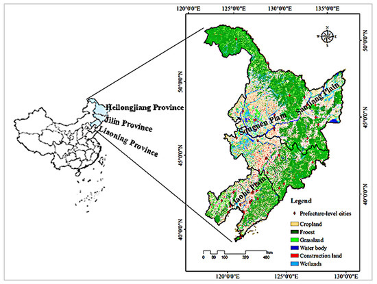 The study area encompasses 36 prefecture-level cities across three northeastern Chinese provinces (38°43′–53°33′ N, 118°53′–135°05′ E): Heilongjiang, Liaoning, and Jilin Provinces (Figure 1), covering an area of approximately 787,300 km2 and accounting for about 8.2% of China’s total land area. The Songnen Plain, Sanjiang Plain, and Liaohe Plain are three of the principal regions of agricultural production. In 2018, the grain-producing region of the three northeastern provinces reached 13.33 million tons, accounting for about 20.3% of the total amount in China. In 2017, the total water consumption in Heilongjiang Province, Jilin Province, and Liaoning Province was 7.43 × 1010 m3, 3.94 × 1010 m3, and 1.86 × 1010 m3, respectively. The agricultural water consumption accounted for 89.6%, 66.1%, and 53%, respectively, and the industrial water consumption accounted for 5.6%, 4.3%, and 13.6%, respectively. The main oil fields in the three northeast provinces are Daqing, Jilin and Liaohe. Daqing Oilfield is China’s largest crude oil supply base. Liaohe Oilfield is the third largest, with oil and natural gas reserves accounting for 15% and 10% of China’s oil, respectively. In 2019, the gross domestic product (GDP) of the three northeastern provinces was 502.46 billion renminbi (RMB), accounting for 5.07% of the total national.