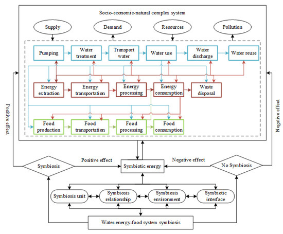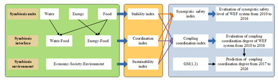 A comprehensive theoretical approach is necessary to apply and detect the reciprocal process of water, energy, and food elements in the WEF system. Recently, the symbiosis theory was introduced in the research of WEF and was helpful for better understanding the complex relationship between WEF and its external environment [41]. In the context of the WEF system, symbiotic relationships are fostered among system elements through coupling mechanisms that ensure the stable and harmonious development of the system [42]. Based on the concept of symbiosis [43,44], these three elements (water, energy, and food) can be considered as the symbiotic units in the development of the WEF system. These units interact directly at the symbiotic interface. At the same time, changes in the social, economic, and ecological environments of the WEF system affect these interactions. Based on the symbiosis theory, Zhi et al. [41] analyzed the WEF nexus in the whole of China and applied the Press-State-Impact-Response (PSIR) model to construct the assessment index system of fitness. The results showed the fitness level in northeast and eastern China were relatively high while the fitness number in the central and western China were relatively low.