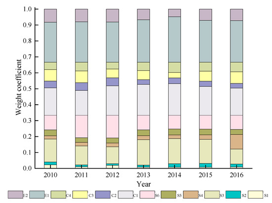The weights of the evaluation indicators reflect the degree of influence that each indicator has on the security of the WEF system. As shown in Figure 4, during the period 2010–2016, the indicators that had the strongest influence on the security of the WEF system in the three northeastern provinces, in descending order of importance, were: GDP per capita, agricultural water use as a proportion of total water use, energy self-sufficiency, food production per capita, and power consumption of agricultural machinery per unit of cultivated land. Thus, these five indicators should be prioritized within the region to improve the synergistic safety of the WEF system.