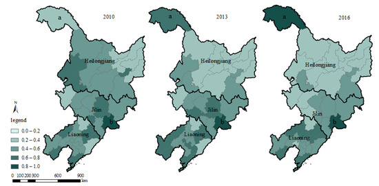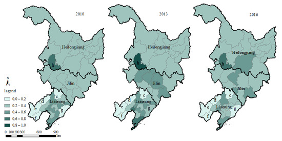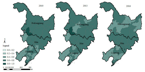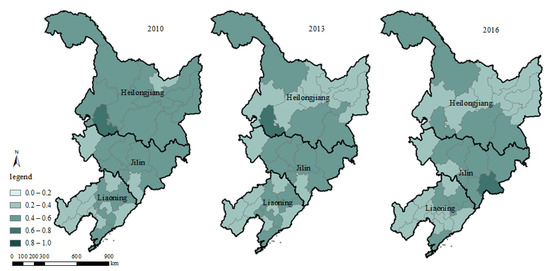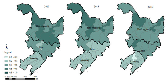 During the period 2010–2016, the stability of the WEF system in each prefecture-level city within the three northeastern provinces increased moving from south to north (Figure 5). Over time, the stability of some prefecture-level cities in Jilin Province shifted to a safe state, with their energy self-sufficiency ratios ranging between 0.6 and 0.8 during 2010–2012, between 0.4 and 0.6 during 2013–2015, and between 0.8 and 1.0 in 2016. This decreasing and then increasing trend may have been influenced by activities implemented under the 12th Five-Year Plan (2011–2015) in Jilin Province. The impact of industrial restructuring during the period of the 13th Five-Year Plan (2016–2020), specifically extensive energy consumption in the secondary industry in Jilin Province to revitalize the northeastern region, resulted in an increased rate of energy self-sufficiency in 2016. Most of the municipalities in Liaoning Province were in a state of insecurity relating to their stability, with their energy self-sufficiency rates ranging between 0.2 and 0.4, which were lower rates compared with those in the other two provinces. This result is linked to the amount of energy consumed in this large province, especially raw coal and crude oil, which account for 98% of the total energy consumption in the province.