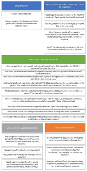 The survey questionnaire ‘Garden heritage in the face of the COVID-19 pandemic’ was distributed online from 19 June 2020 to 12 August 2020. It contained four categories of questions: the situation of gardens during the COVID-19 pandemic, maintenance, and care in gardens, virtual activity and communication, financial consequences (Figure 2). The questionnaire consisted of 23 questions. Eleven of them were open-ended questions, and twelve were closed-ended. The latter were single-select and multi-select questions depending on its scope. The respondents could offer a comment on some of them to provide more in-depth insight. Open-ended questions focused on issues where qualitative results were desirable to provide a broader view of the impact of the pandemic on historic gardens.