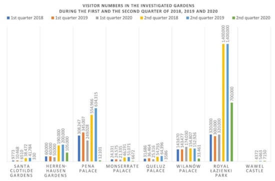 Visitor numbers in the investigated gardens during the first and the second quarter of 2018, 2019, and 2020.