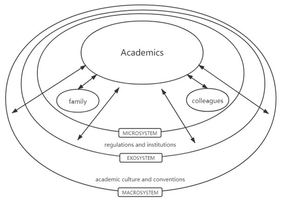 The macrosystem refers to “the overarching institutional patterns of the culture or subculture, such as the economic, social, educational, legal, and political systems, of which micro-, meso-, and exo-systems are the concrete manifestations” [55] (p. 515). Hence, laws, regulations, unprinted cultural values, customs, conventions, and norms are the key components of the macrosystem. The macrosystem in this research is manifested by research-related cultural values, customs, conventions, and norms. Although these elements may seem distant from individual academics, the potential impact they have on research should be noticed, especially when considering returned graduates who have complex cross-cultural experiences and have to readjust to their home culture.