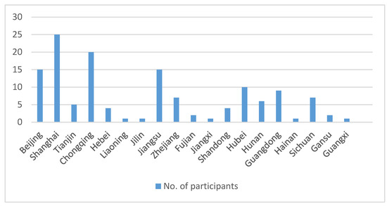 The geographical locations of the participants’ universities are generally divided into eastern, central, and western regions [60]. Figure 3 detailed the number of respondents in each province; more specifically, the eastern region includes 11 provinces and municipalities such as Beijing and Shanghai; the central region includes three provinces, namely Hunan, Hubei, and Jiangxi; the western region includes the four provinces of Chongqing, Sichuan, Gansu, and Guangxi. We used one-way ANOVA to analyze the regional differences in the respondents’ perception of external factors.
