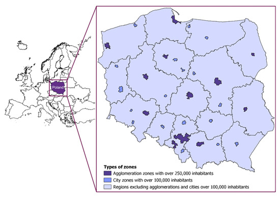 The analysis was carried out using a 3-year dataset on air quality from 2015–2017, covering the whole Poland [27]. Air quality data included the measurements collected within the National Environmental Monitoring network, which is the official air quality measurement system of Poland, reporting its results to the European Commission. The analysis was aggregated to 46 air quality assessment zones [28], determined (as required by AAQ Directive) by the Regulation of the Minister of the Environment of 2 August 2012 on zones where air quality is assessed (AQ zones) (Journal of Laws of 2012, item 914)—see Figure 1.