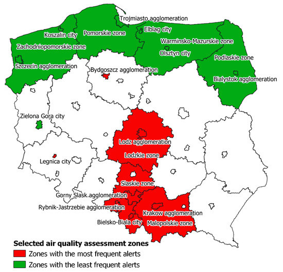 Location of zones with the most frequent (red) and the least frequent (green) potential PM alerts in Poland.