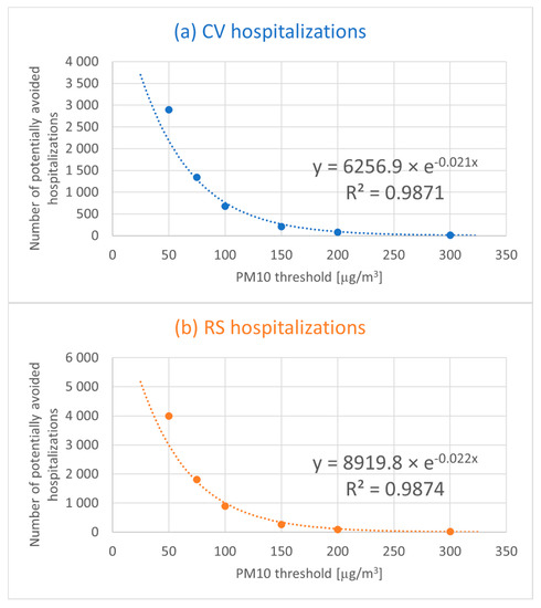 The potential positive effect of assumed scenarios decreases with increasing PM10 daily threshold values. For both health endpoints, this decrease is very well described with exponential models—see Figure 3.