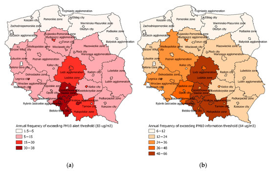 To achieve 75% of the health gain (reduced hospitalizations) expected for the BCS, the threshold equal to 64 µg/m3 would be required, and for 50% of BCS, the threshold for daily PM10 should be 83 µg/m3. As the results summarized in Table 2 indicate, such thresholds would be linked with limited frequency of alerts: On average 12 times per year in all zones in Poland (from less than 2 times in Białystok agglomeration located in the North-East part of Poland to 38 times in Rybnik-Jastrzębie agglomeration in the South—see Figure 4a). Suggested information threshold would be reached on average 25 times annually, ranging from 6 times in Koszalin city and Podlaskie zone up to 66 times in the Rybnik-Jastrzębie agglomeration (Figure 4b).