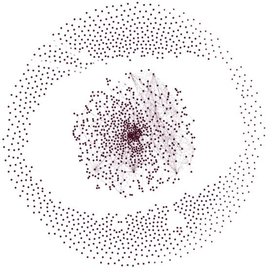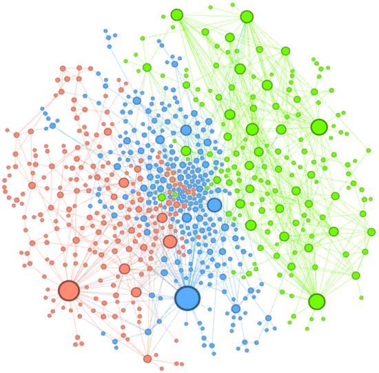 - Bastian, M.; Heymann, S.; Jacomy, M. Gephi: An open source software for exploring and manipulating networks. In Proceedings of the Third International AAAI Conference on Weblogs and Social Media, San Jose, CA, USA, 17–20 May 2009. [Google Scholar]