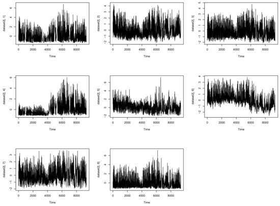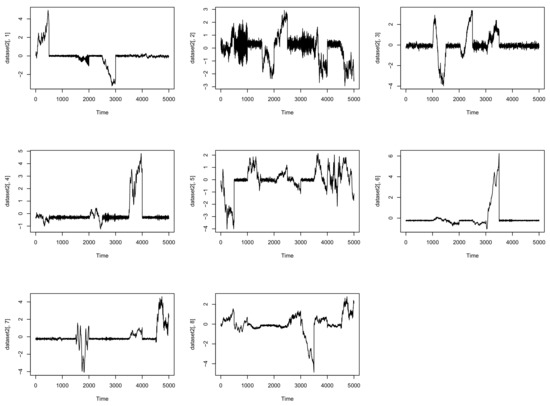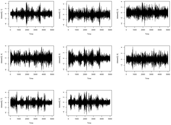 The first simulation dataset is obtained using VAR.sim function from package multivar in R that aims to generate VAR-based simulation data. Since real-life datasets in the later sections are eight-dimensional, we generated the same eight-dimensional time-series data, , and set the last one, as a target time-series, , for forecasting. One example is provided in Figure 1. The length of each time-series is 5000 with the first 4000 data used for training and the remaining 1000 data for testing. There is no anomaly in this first simulation with stationarity compared with simulations without stationarity in the next section.