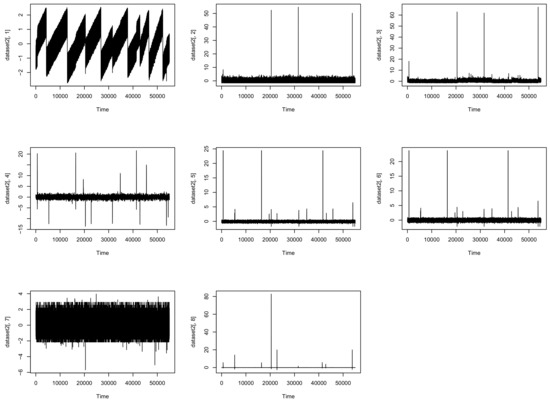 The one-year dataset (https://archive.ics.uci.edu/ml/datasets/Air+Quality) from March 2004 to February 2005 [24], registered at UCI Machine-Learning Repository, has 9358 samples of hourly averaged responses obtained by five metal oxide chemical sensors embedded in an Air Quality Chemical Multisensor Device. Originally, this was used to prove cross-sensitivities and improve sensor capabilities of concentration estimation [25]. For application to the proposed method, we selected eight columns, CO(GT), PT08.S1(CO), C6H6(GT), PT08.S2(NMHC), NOx(GT), PT08.S3(NOx), PT08.S4(NO2), and PT08.S5(O3), and set the C6H6(GT) representing hourly averaged Benzene concentration as a target value for time-series forecasting because this is one of the most important target values in the previous reference. This is visualized in Figure 3.