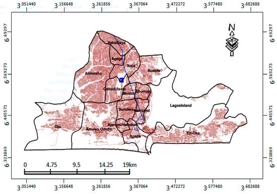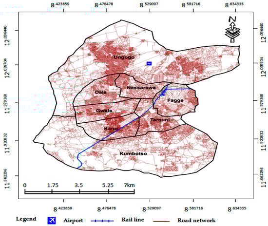 With the rising multi-scale challenges to transport infrastructures and mobility in most cities, resilience thinking remains a key underpinning component of the achievement of functional environments that are both fit-for-purpose and fit-for-future. Transport resilience highlights the pathways for cities’ survival against growing scenarios of congestion, delays, and socioeconomic losses due to natural and artificially induced challenges (e.g., climate change, environmental pollution, earth tremors, deforestation, erosion, and degradation from mining activities). A number of resilience analytical tools—e.g., artificial intelligence and agent-based modelling techniques, including artificial neural networks (ANN) [14], fuzzy systems (FS) [15], adaptive network-based inference systems (ANFIS) [16] and genetic algorithms [17]—have been deployed for the analysis and prediction of complex system resilience. On the basis of the demographic information, inventory of transport infrastructure and mobility data available, resilient models may be fitted with artificial neural networks (ANN) in order to forecast the resilience of transport services in the Nigerian cities (Kano and Lagos as a case study). Figure 1 and Figure 2 are the digitized maps of the main statistical areas constituting the urban conurbations of Kano and Lagos, respectively.