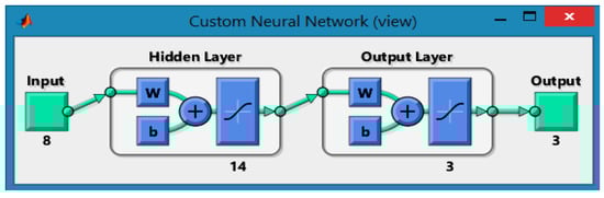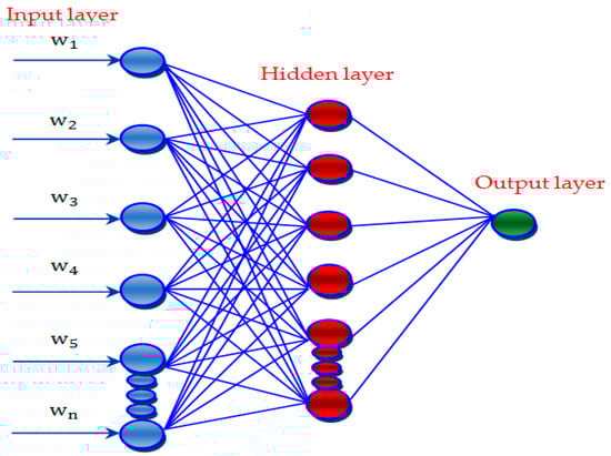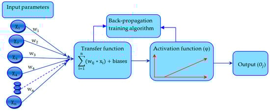 The parameters that affect the output are the learning rate, batch size, weights, biases, optimizer, epoch, width, and depth. Every node within the network allocates some weights, and the weighted sum of the inputs and the bias is determined using a transfer function. Then, the activation function which obtains the output result releases the most acceptable result from the node based on the received data [40]. Some of the commonly-used activation functions in ANN include Sigmoid, RELU, Softmax, and Tanh, etc. Figure 4 shows the architecture that accompanies the typical ANN model previously shown in Figure 3.