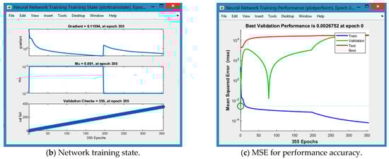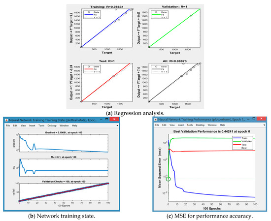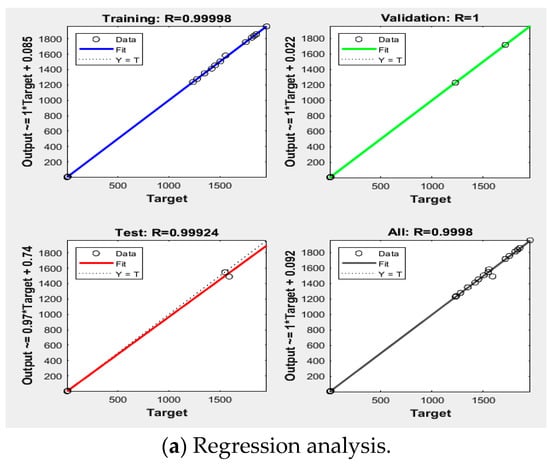 The proposed model testing and simulation requires correlation and the use of the mean squared error (MSE), representing the error calculated from the network output and the targets for the assessment of the performance function of the network. The MSE is the performance function that measures the accuracy of the model’s prediction error, and it can control the extent of the correlation between the real and the forecast values, which is otherwise known as the Pearson Correlation Coefficient. In order to mitigate model over-fitting, a widely-used approach during the training of models of NN was adopted, in which the data are randomly split into three phases: training, validation and testing [55]. As such, the data were randomly divided into 70%, 15%, and 15% sets for the training, testing and validation, respectively, with a maximum of 1000 epochs. Figure 6 shows a custom view of the nftool fitting model adopted. Table 7 and Table 8 are the MSE, R and forecasting equations for the various algorithms used for the prediction. Figure 6 and Figure 7 show the accuracy of the regression plots for the Levenberg–Marquardt (LM) model, which fits better than other the algorithms, i.e., Bayesian Regularization (BR) and the Scaled Conjugate Gradient (SCG).