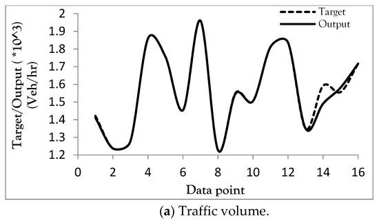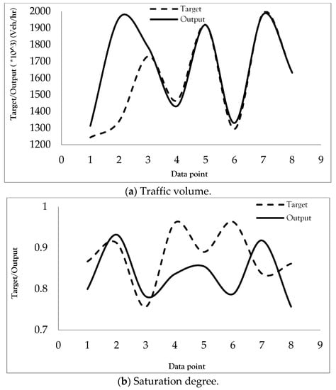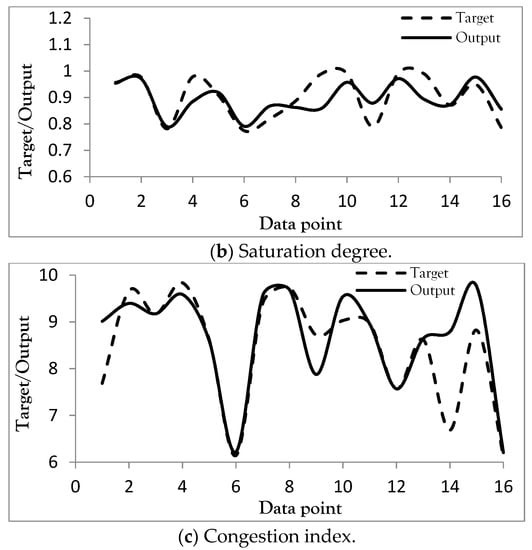 Table 6 and Table 7 are evidence that LM provides a better approximation compared to the other two algorithms. Table 8 and Table 9 are the summaries of the NN output simulation with the normalized target forecast. Figure 8 and Figure 9 provide a comparison of the target network and the predicted output values of the traffic volume, saturation degree and congestion indices. The high regression values for the LM for the two cities ( R = 1.000 ) shows the suitability of the model and the better performance of LM ahead of BR and SCG [58].