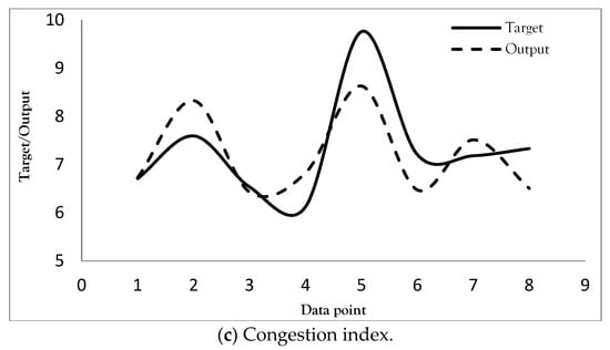 In Figure 9 and Figure 10, the predicted values are moderately close to the target values, and could represent accurate predictions for the monitoring of the persistent congestion of the road traffic in Nigerian cities. The figures show that the model is very accurate in terms of calibration and prediction accuracy because the relative errors are small. The prediction, as demonstrated, is very useful for neural networks, such that a preprocessing of the real data is applied in order to predict the congestion rating as an indicator of transport service and infrastructure qualities. In both cities, the poorly-defined and complex areas of mobility resilience reveal substantial deficiencies in the complementary role of urban spatial dynamics, policy targets and benchmarks, traffic demand, public transit strategy, and low sustainability. In their various synoptic applications of ANN, researchers have observed that a multi-layer feed-forward back-propagation model provides a better fitting quality for traffic congestion, but lacks the capacity for a time series forecast in which a large pool of data is not available [63,64].