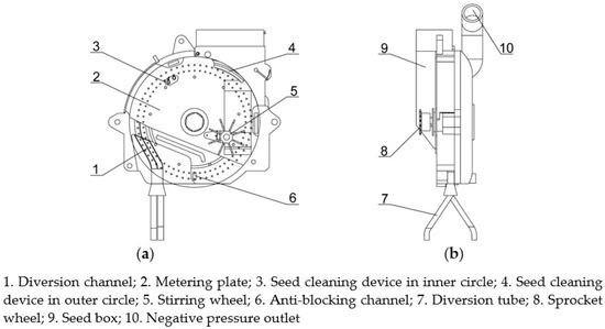 Integral structure of seed metering device: (a) Front view; (b) Side view.